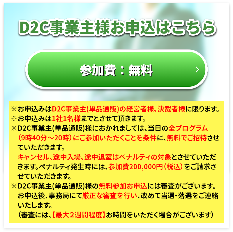 • ※D2C事業主(単品通販)様の無料参加お申込には審査がございます。